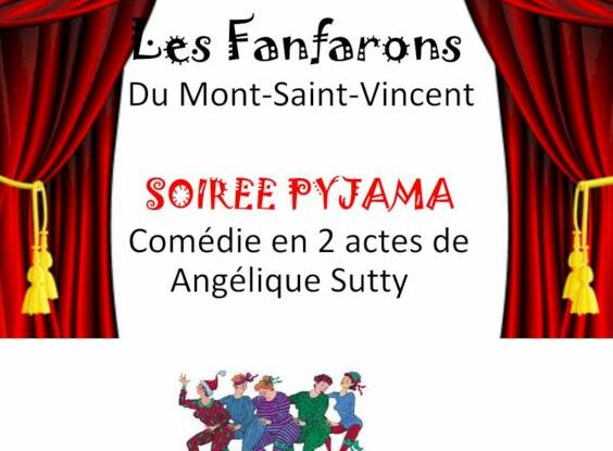 Après Saint Vallier et Montchanin, dernières représentations de la saison pour la troupe des Fanfarons…..pour le Rire et le Meilleur à Mont-Saint-Vincent, samedi 24 janvier à 20h et dimanche 25 janvier à 15h. Ouverture des portes 1 heure avant le spectacle Entracte Buvette Tombola… Synopsis : La soirée pyjama :…