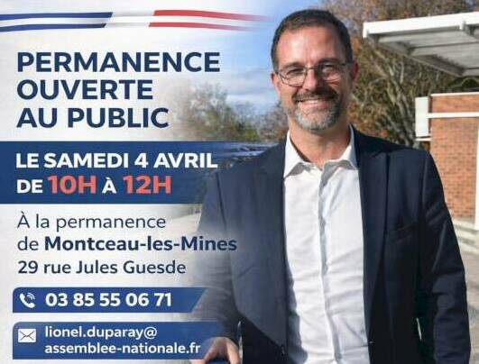 Permanence ouverte du Député Lionel Duparay à Montceau-les-Mines. Le Député de Saône-et-Loire, Lionel Duparay, tiendra une permanence ouverte au public ce samedi 04 avril 2026, de 10h00 à 12h00, dans ses locaux de Montceau-les-Mines situés 29 rue Jules Guesde. Cette permanence sera l’occasion pour les habitants de venir échanger avec…