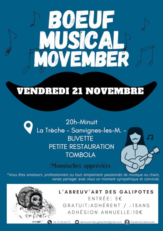 A ne pas manquer, bien évidemment, le vendredi 21 novembre 2025, date du boeuf musical à la Trèche, spécial Novembre. Chaque année, novembre est le mois de la moustache ! Depuis 2003, Movember (ou, plus rarement Novembre Bleu) est un événement caritatif qui a pour but de sensibiliser les hommes à leur santé et notamment sur les cancers masculins (prostate, testicule) en les invitant à se laisser pousser la moustache pendant 30 jours du 1er au 30 novembre 2025.