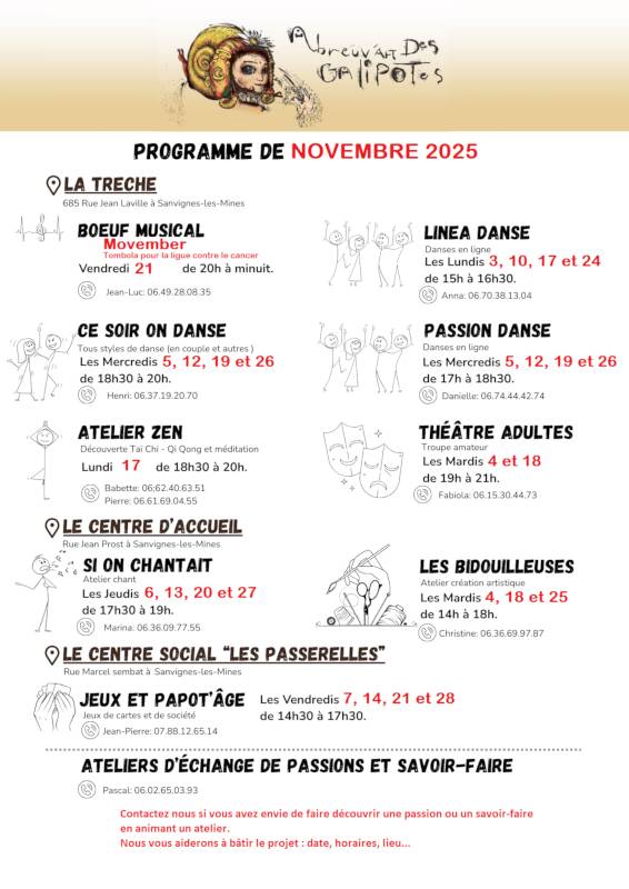 A l’association l’Abreuv’Art des Galipotes, les mois se suivent et les activités s’enchaînent au rythme des saisons. Il suffit de jeter un oeil sur le calendrier pour se rendre compte que le mois de novembre est dense. On danse, on, chante, on fait du théâtre et on reste zen en toutes circonstances. A vous de choisir !