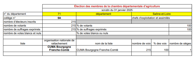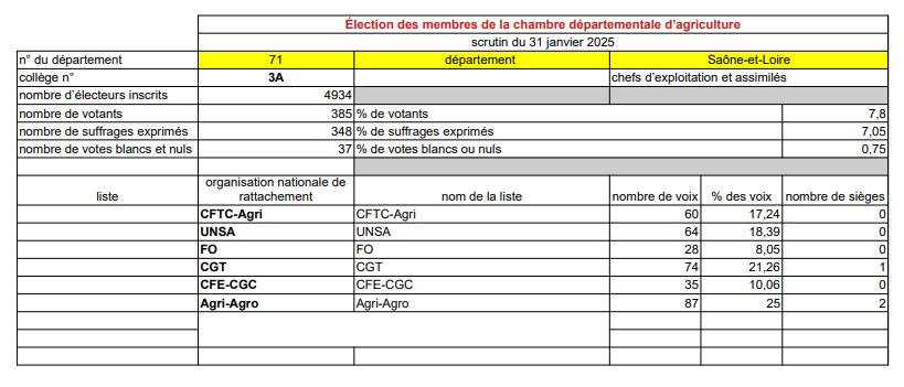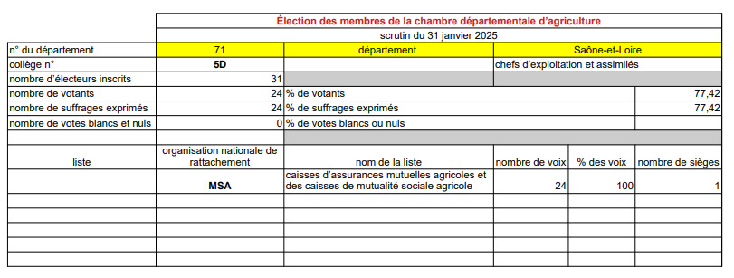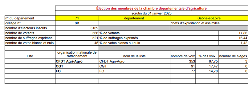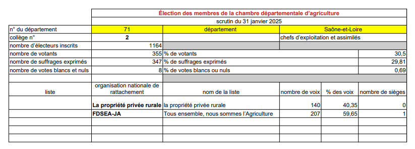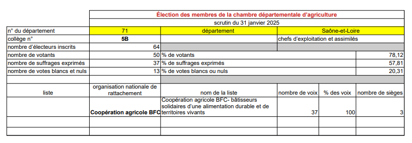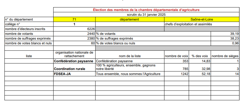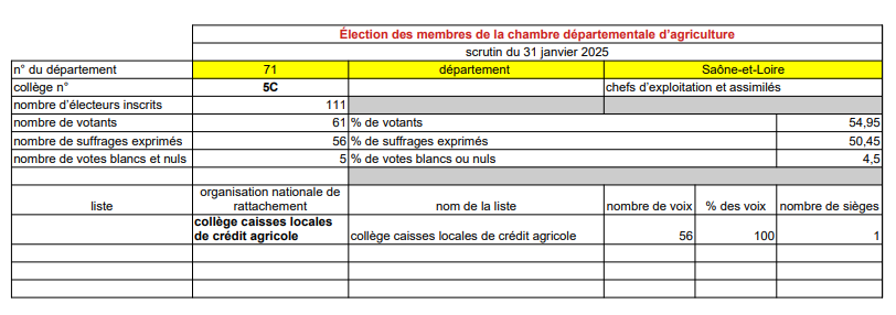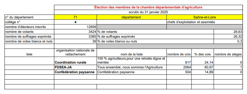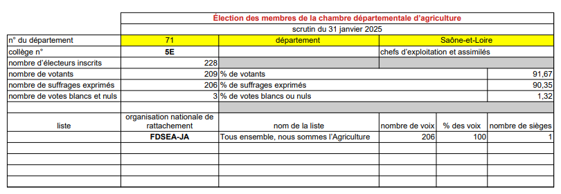 Résultats des élections des membres de la chambre départementale d’agriculture de Saône-et-Loire de 2025.