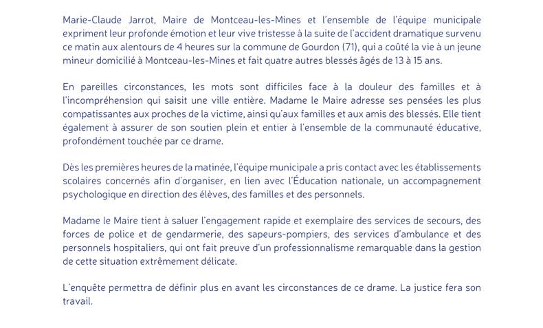 Dans un communiqué (lire ci-dessous), la ville de Montceau-les-Mines tient à exprimer sa profonde émotion et sa vive tristesse.