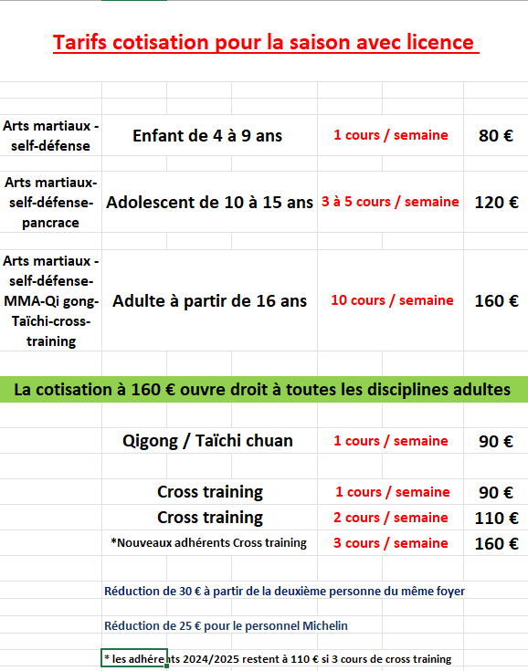 Vous avez du choix : Self-défense ,M.M.A., Pancrace , Arts martiaux/ Kobudo , Taïchi / Qigong, cross training , tout cela au même endroit, 7 disciplines étalées sur 14 cours dans la semaine.