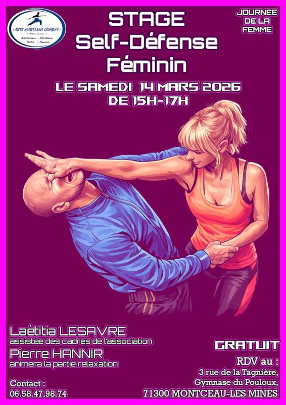 Ce sera le samedi 14 mars de 15h00 à 17h00 dans le gymnase du Pouloux, Madame Laëtitia Lesavreen assumera l’animation accompagnée par les cadres du dojo. Le stage sera suivi d’une animation relaxation avec Pierre Hannir.