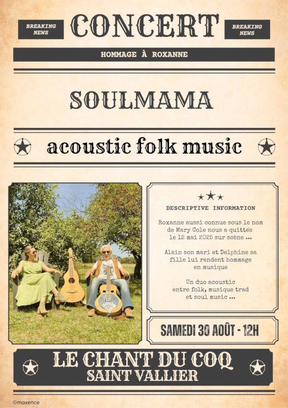 A Saint-Vallier, samedi 30 août 2025, au Chant du Coq, est organisé un concert hommage à Mary Dole qui est décédée le 12 mai 2025 sur scène. Elle chantait du gospel avec son mari qui avec sa fille, Delphine, va lui rendre hommage en musique.