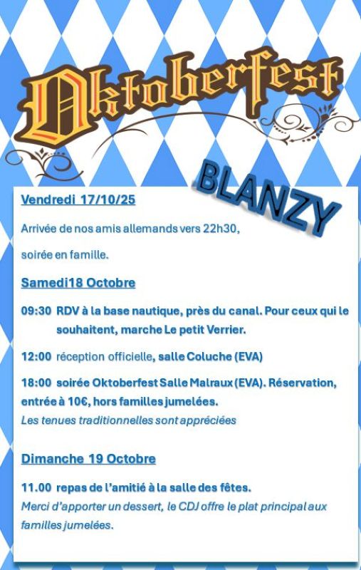 Cependant, la soirée du samedi 18 octobre (à partir de 18h) se voudra typiquement allemande, avec plus de 50 allemands de la ville jumelle venus pour l’occasion. Il y aura des planches apéritifs, des bières bavaroises. Pour se restaurer, vous aurez des bretzels élaborés par un artisan boulanger, des saucisses blanches munichoises importées directement d’allemagne, des frites, des gaufres.
