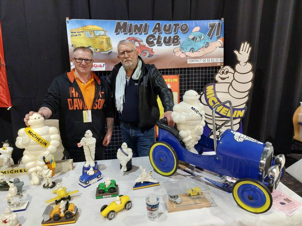 Un peu plus loin, sur la scène de l’EVA, une autre rencontre fait pétiller les yeux. Gilbert, Blanzynois passionné, a trouvé son alter ego en la personne de Jean-Luc Valette, venu de Digoin. Leur point commun ? Les figurines du Bibendum, la célèbre mascotte Michelin.