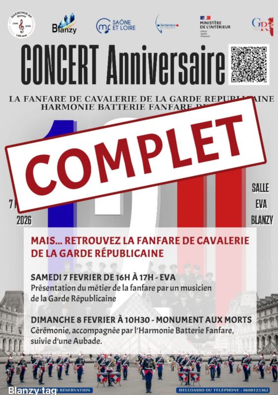 Le concert avec la fanfare de la Garde Républicaine de Paris, samedi 7 février 2026 étant complet, il y aura une cérémonie suivie d’une aubade le dimanche 8 février, ouverte à tous au monument aux morts de Blanzy à 10h30.