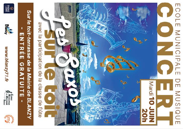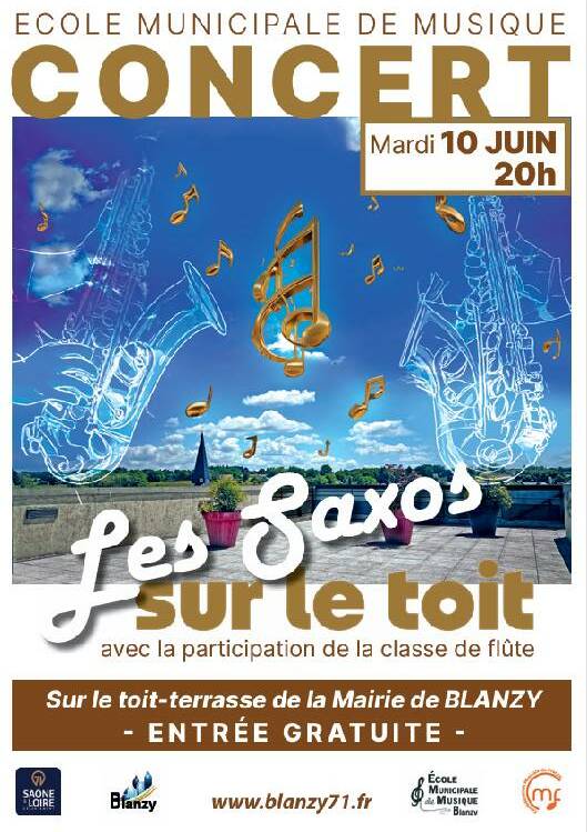 Nouvelle édition des Saxos sur le Toit le mardi 10 juin à 20h00 sur le toit-terrasse de la mairie de Blanzy. Un moment musical et convivial en plein air proposé par Jérôme Daguenet, professeur de saxophone à l’Ecole Municipale de Musique de Blanzy. A noter la participation d’un quatuor de flûtes dirigé par Elodie Michel-Trigon.