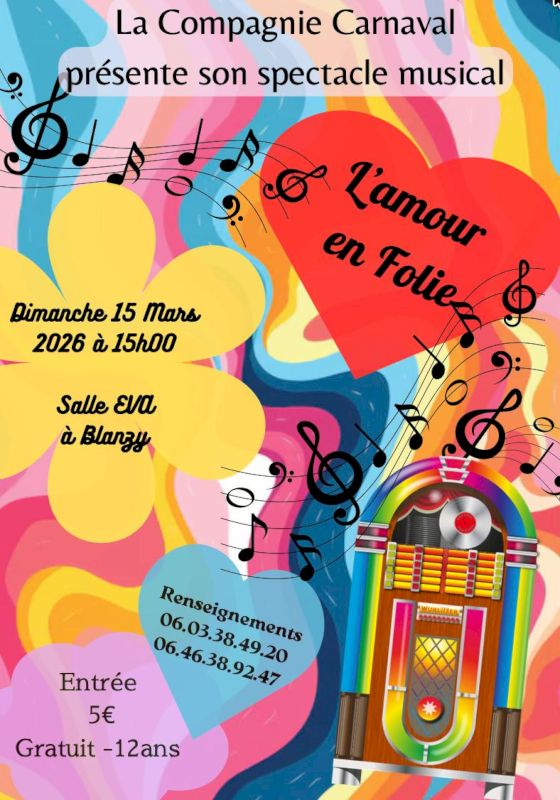 Dans le cadre du festival, Blanzy en mars en famille, la compagnie Carnaval présente son spectacle musical, « L’amour en folie », dimanche 15 mars 2026 à l’EVA à 15h.