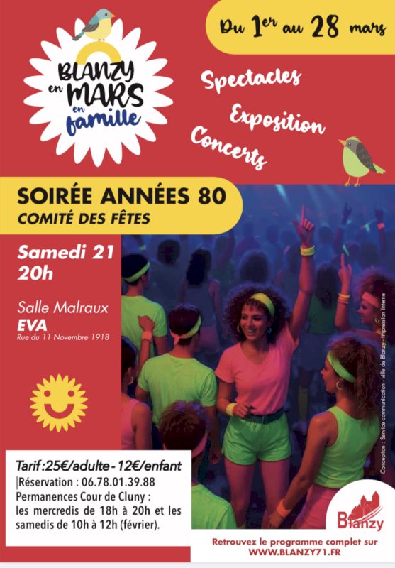 Dans le cadre du festival Blanzy en mars en famille, le comité des fêtes organise une soirée année 80 le samedi 21 mars 2026 à partir de 19h à la salle des fêtes de Blanzy.