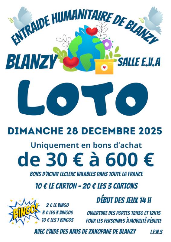 Que faire entre Noël et le jour de l’An ? Jouer au loto, ça tombe sous le sens, surtout à Blanzy avec L’entraide Humanitaire avec le soutien des Amis de Zakopane.