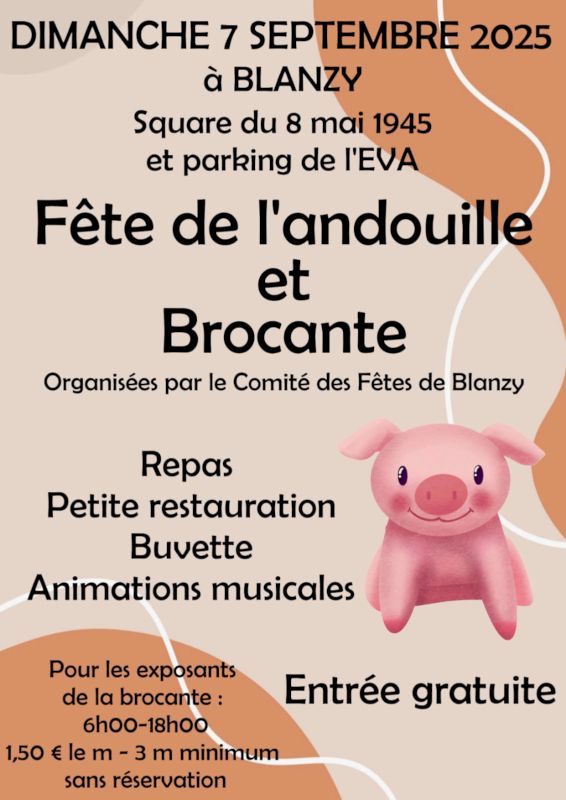 Le dimanche 7 septembre 2025, le comité des fêtes de Blanzy organise sa traditionnelle fête de l’andouille, avec cette année une brocante sur le parking de la salle des fêtes de Blanzy.