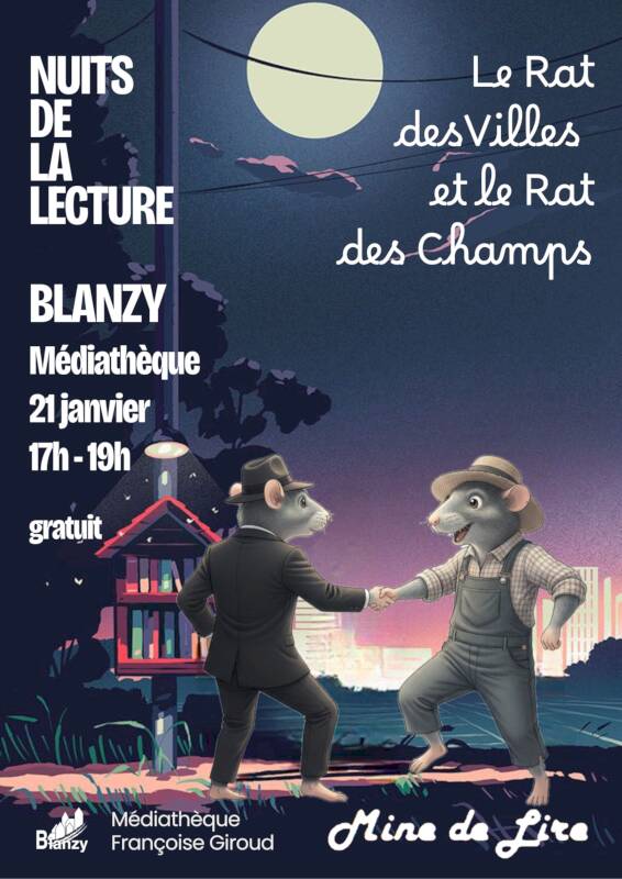 Mine de lire organise en partenariat avec la médiathèque de Blanzy, la nuit de la lecture mercredi 21 janvier 2026 de 17h à 19h. La thématique nationale : entre Ville et Campagne sera déclinée en Rat des Villes et Rat des Champs.