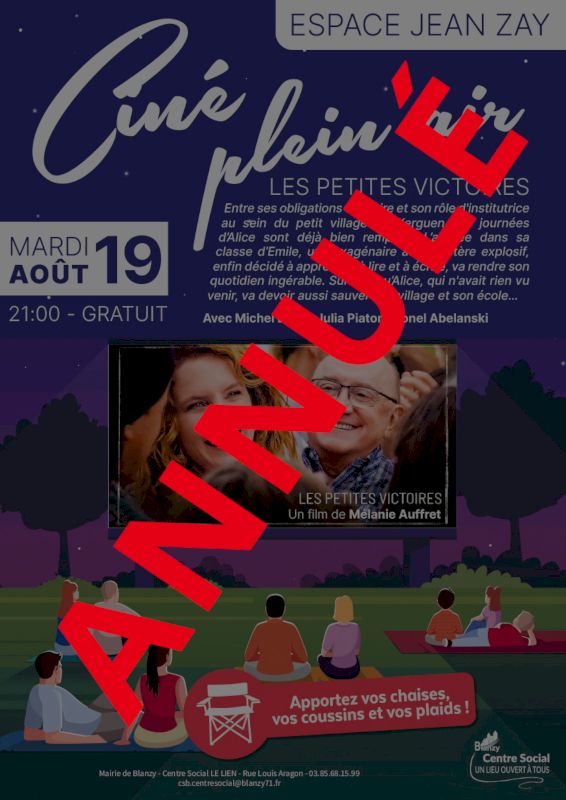 En raison des conditions météorologiques défavorables (orages annoncés en soirée), la Mairie de Blanzy se voit contrainte d’annuler le ciné plein air prévu ce mardi 19 août 2025.