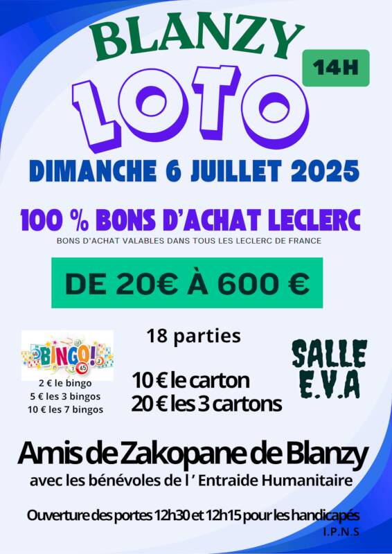 Justement, l’association les Amis de Zakopane avec les bénévoles de l’Entraide Humanitaire, organise un loto ce dimanche 6 juillet à l’EVA, début de la première partie à 14h. Comme d’habitude, que des bons d’achat à gagner dont un de 600 €