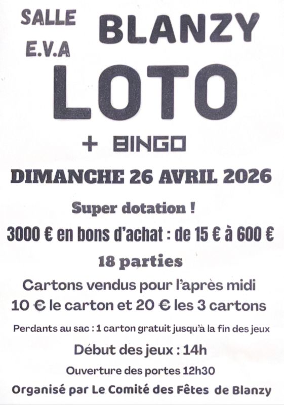 Blanzy – Loto du comité des fêtes dimanche 26 avril