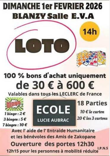 Alors dimanche 1er février 2026, venez jouer à la salle EVA de Blanzy où l’école Lucie Aubrac organise son loto avec le soutien de l’Entraide Humanitaire et les bénévoles des Amis de Zakopane.