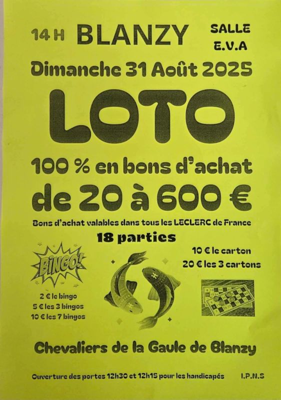 Ce dimanche 31 août 2025, dans l’après-midi, les Chevaliers de la Gaule vont délaisser les cannes à pêche pour organiser un loto à l’EVA de Blanzy à partir 14h.