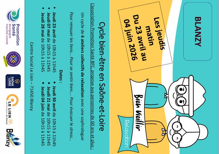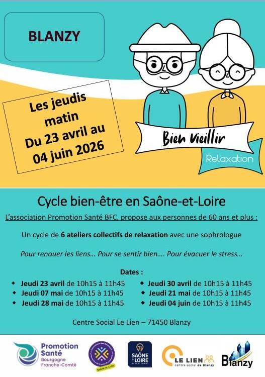 Dans le cadre d’un projet de prévention santé, l’association Promotion Santé BFC- antenne 71, en partenariat avec la commune de Blanzy et le centre social Le Lien, met en place son programme « Bien vieillir » à destination des personnes âgées de plus de 60 ans du territoire, pour renouer les liens…, pour se sentir bien…, pour évacuer le stress….