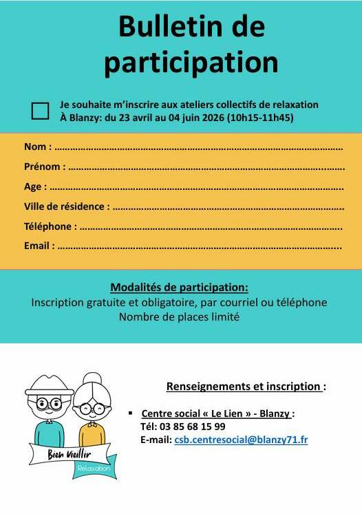 Renseignement et inscription : Centre social « Le Lien » – Blanzy : Tél: 03 85 68 15 99
