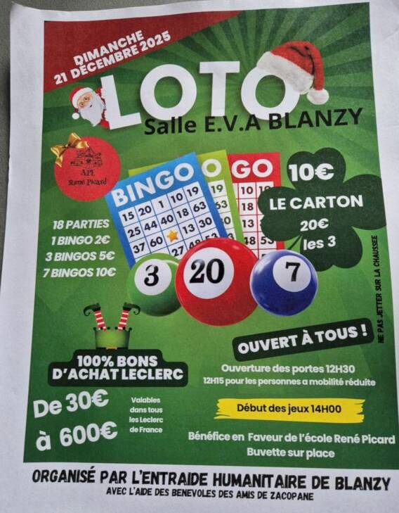 Dimanche 21 décembre 2025, loto à l’EVA de Blanzy organisé par l’entraide humanitaire de Blanzy avec l’aide des bénévoles des Amis de Zakopane.