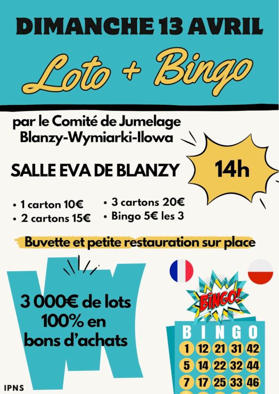 Le comité de jumelage Blanzy-Wymiarki-Ilowa (Pologne), organise un loto + bingo, dimanche 13 avril 2025 à l’EVA de Blanzy.