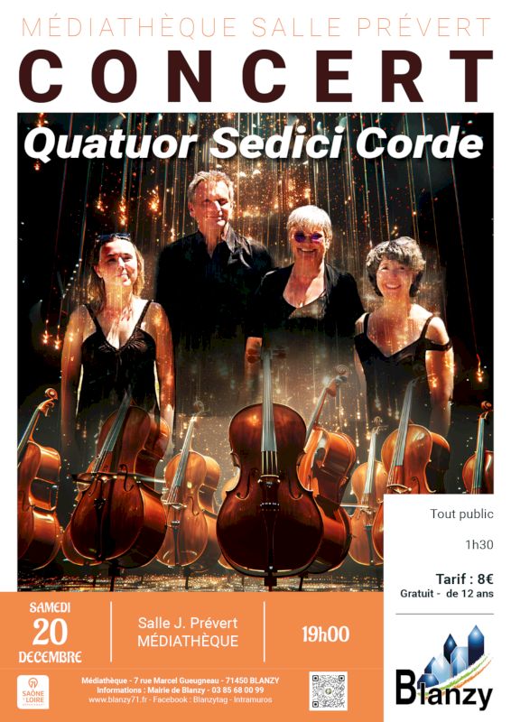 Samedi 20 décembre, la Médiathèque de Blanzy vous invite à un moment magique avec le Quatuor Sedici Corde, un ensemble musical bourguignon composé de Nelly Lousteau et Yves Marrilliet aux violons, Claire Vincent à l’alto et Lorraine Brosse au violoncelle. Ces musiciens passionnés, diplômés des conservatoires de Dijon, Genève, Bâle et Bruxelles, enseignent dans la région et se produisent régulièrement en concert, proposant un répertoire varié allant de Schubert à Lady Gaga, en passant par les grands classiques comme Haydn ou Dvořák.