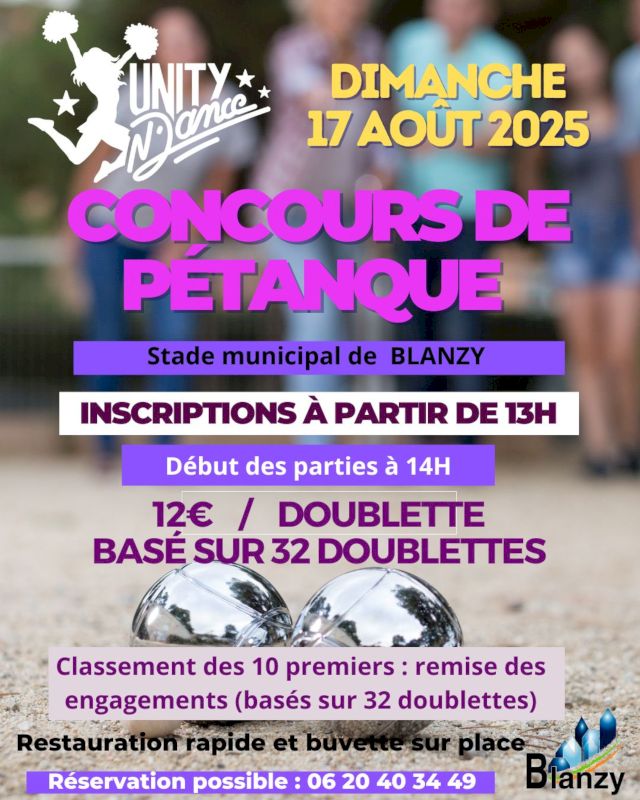 Vous aimez Unity N’Dance, alors vous allez adorer son concours de pétanque en doublette qui est organisé dimanche 17 août 2025 au stade Guillaume Warmuz (ex-stade municipal) à Blanzy.
