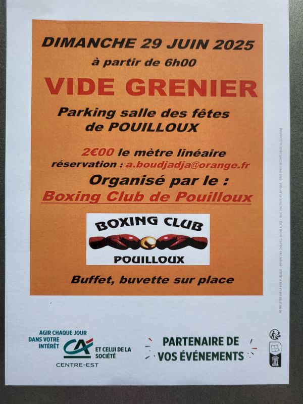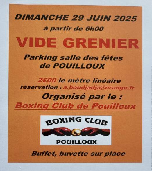 A noter dans vos agenda que le Boxing Club de Pouilloux organise sa brocante le dimanche 29 juin à la salle des fête de Pouilloux.