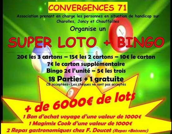 L’association regroupant les ESAT ( Etablissements et services d’aide par le travail) de Joncy, Chauffailles et EAM (Etablissement d’accueil médicalisé) de Charolles, organise un loto le dimanche 26 octobre 2025 dans le Hall des Expositions de Charolles. C’est un super loto + bingo avec plus de 6000 € de lots…