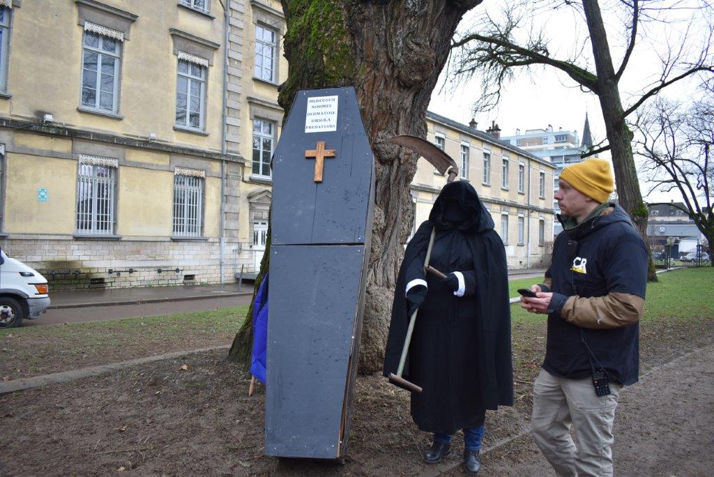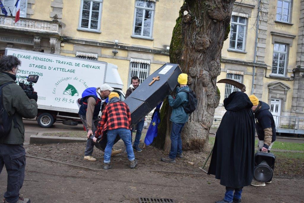 Après un défilé dans les rues de Chalon, une cérémonie a eu lieu dans le square Chabas avec le dépôt d’un cercueil. La faucheuse est venue récupérer son dû: la mort de l’agriculture française.