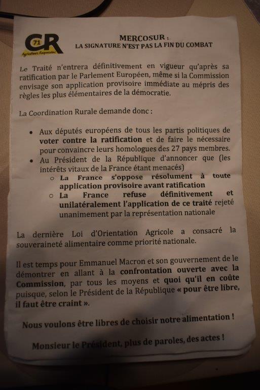 La coordination Rurale dénonce sa validité et surtout la rejette en bloc. Une plainte a été déposée symboliquement au procureur de la République du tribunal de Chalon/Saône contestant le pouvoir de madame Ursula Van der Leyen à signer cet accord puisqu’elle n’a reçu pour cela aucun mandat démocratique, n’ayant été élue par personne.