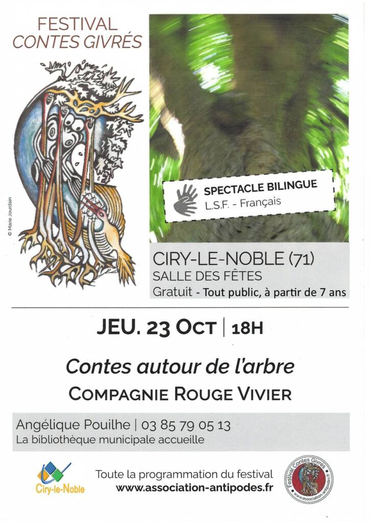 - « Contes autour de l’arbre » : Dans le cadre du festival des contes givrés, la bibliothèque de Ciry-le-Noble accueillera le spectacle « Contes autour de l’arbre » de la compagnie Rouge Vivier le jeudi 23 octobre à 18h à la salle des fêtes. Ce spectacle est bilingue sourds/entendants puisqu’il est signé à quatre mains. Les 2 artistes, l’un sourd et l’autre entendant jouent et signent ensemble dans un duo qui se complète parfaitement. Les spectateurs eux-mêmes sont initiés avant le début du spectacle.