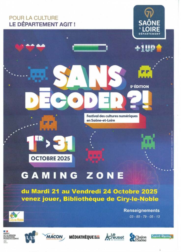 - Festival Sans décoder, organisé par le département de Saône et Loire : Le festival des cultures numériques revient cette année en mode rétro ! L’univers des jeux vidéo vous intéresse ? La bibliothèque de Ciry-le-Noble vous propose de découvrir des jeux de société adaptés de jeux vidéo ainsi qu’une exposition sur ce thème. Venez jouer à la bibliothèque la semaine du 21 au 24 octobre aux horaires d’ouverture.