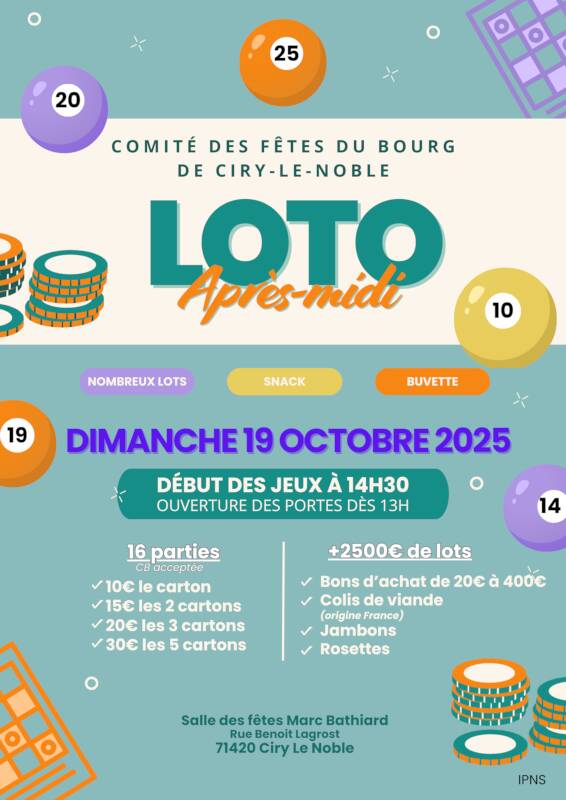 Le comité des fêtes du bourg de Ciry-le-Noble organise un loto dimanche 19 octobre 2025 à la salle des fêtes. Ouverture des portes à 13h, première partie à 14h30.