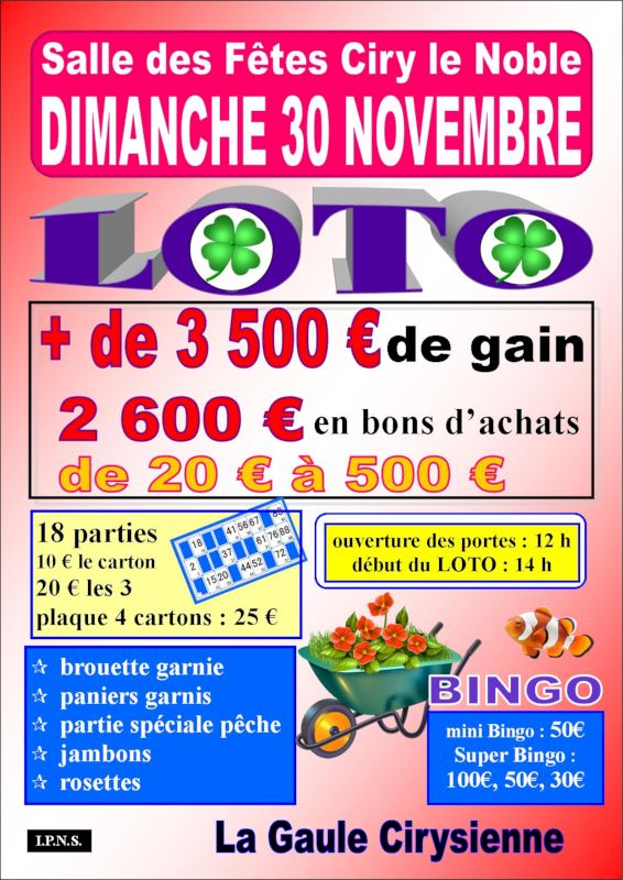 La Gaule Cirysienne organise son prochain loto, dimanche 30 novembre, à la salle des fêtes de Ciry le Noble.
