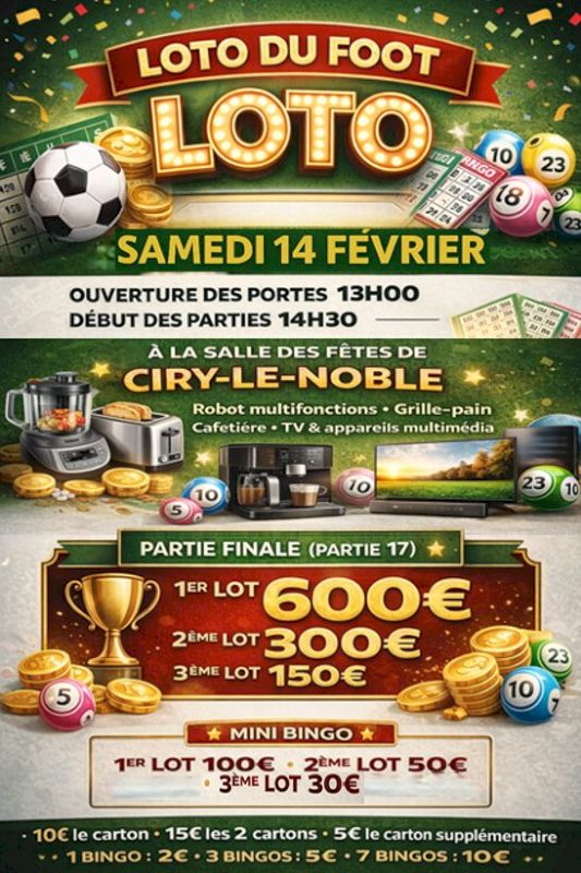 Loto de l’AS Ciry à la salle des fêtes de Ciry-le-Noble, le samedi 14 février 2026, ouverture des portes à 13h pour début de la première partie à 14h30.
