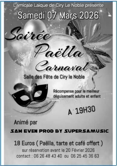 Ensuite, rendez-vous à partir de 19h30 à la salle des fêtes pour déguster une paëlla (18 €) sur réservation avant le 20 février au 06 26 48 43 40 ou 06 25 45 36 63.