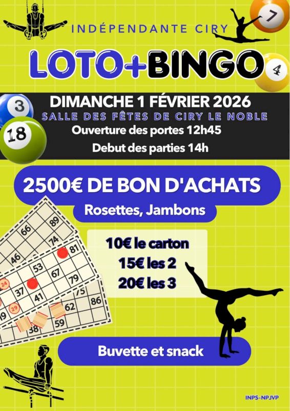 Loto Bingo de l’indépendante gym de Ciry-le-Noble, dimanche 1er février 2026. Ouverture des portes à 12h45, début des parties à 14h00.