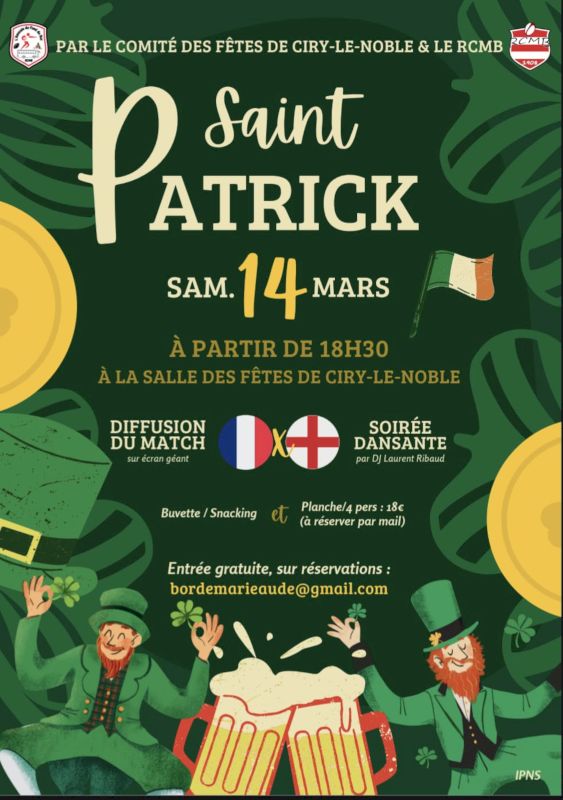 Le samedi 14 mars 2026 risque d’être une journée mémorable à la salle des fêtes de Ciry-le-Noble. Non seulement l’amicale des joueurs du RCMB et le comité des fêtes de Ciry vous invitent à fêter la Saint-Patrick mais peut-être aussi, célébrer le grand Chelem du XV de France puisque ce jour-là, la France affrontera l’Angleterre, match retransmis sur écran géant ce soir-là. A condition aussi d’aller gagner en Ecosse le 7 mars.