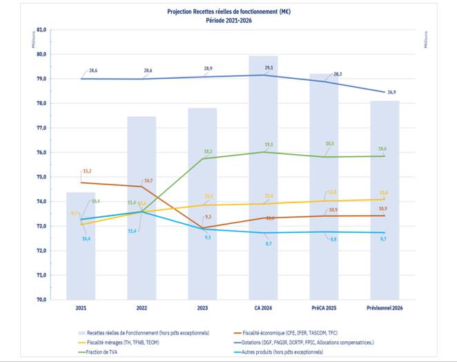 Les ressources prévisionnelles pour l’exercice 2026 ont été évaluées à 78,1 M€ en prenant en compte une partie des mesures envisagées pour les collectivités par l’Etat. Sur cette première base, l’évolution des recettes réelles de fonctionnement par rapport au BP 2025 est en baisse de 1,3% et de 1,7% par rapport au budget total voté (reprise des résultats et produits exceptionnels retraités).