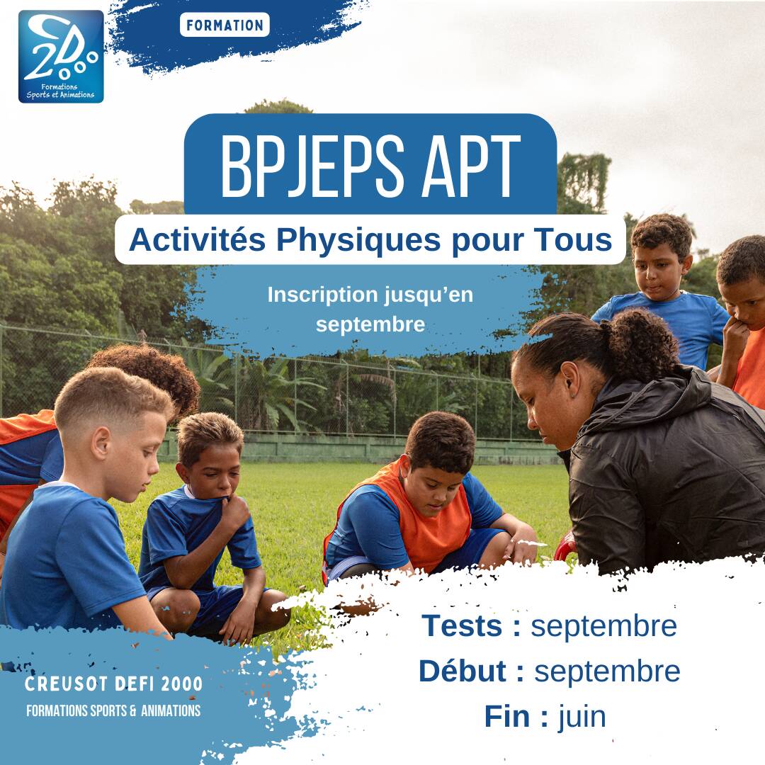 Le BPJEPS APT est un diplôme d’Etat de niveau IV (niveau BAC) qui prépare aux métiers d’animateur et d’éducateur sportif au sein de structures privées (du secteur associatif ou marchand) ou au titre de travailleur indépendant.