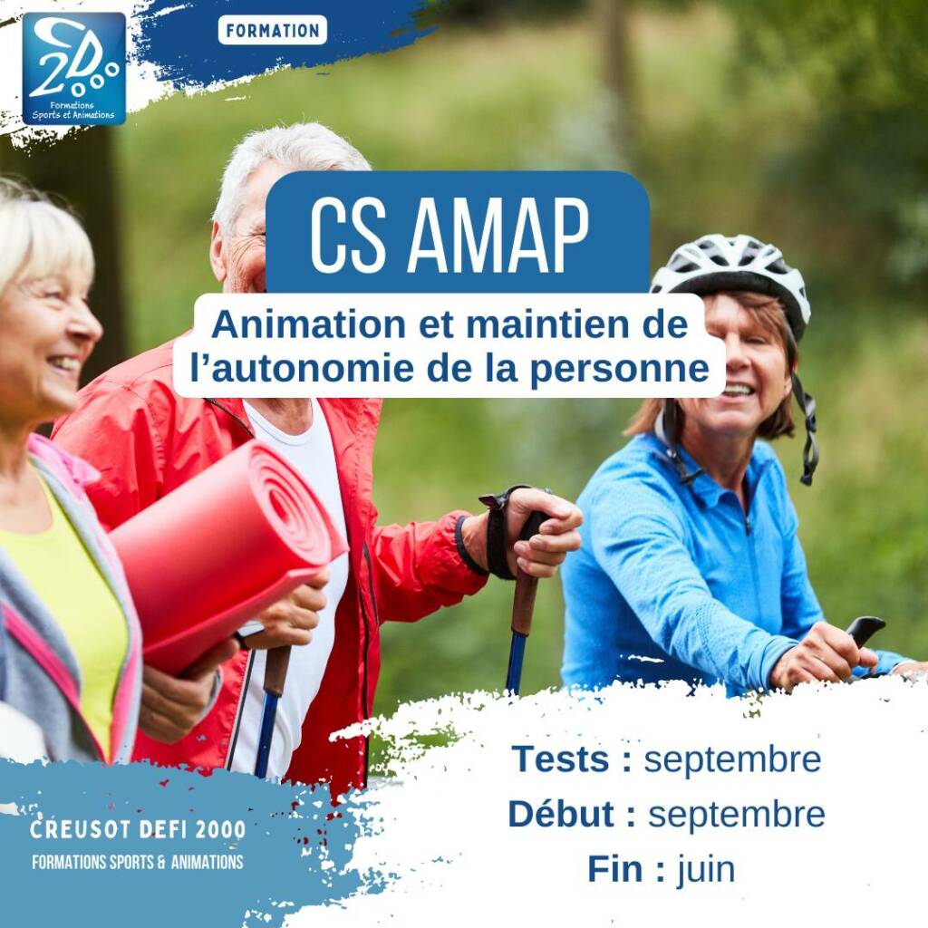 En complément de cette formation, les stagiaires pourront également obtenir le CS AMAP (Certificat de spécialisation Animation et Maintien de l’Autonomie de la Personne) qui leurs permettra d’acquérir une expertise dans le « Sport santé » afin de pouvoir intervenir auprès de publics fragiles et/ou en perte d’autonomie (Personnes atteintes de maladies chroniques, Maison de retraite, réseau diabétologie, personnes en situation de handicap, EHPAD…), en leurs proposant des activités de maintien des capacités physiques, d’entretien de la mémoire, de maintien du lien social…