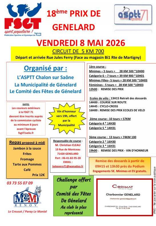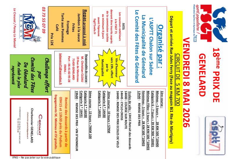 L’ASPTT Chalon a en charge l’organisation du 18ème Prix de Génelard. Celui- ci aura lieu le vendredi 8 mai avec le soutien financier de la Municipalité. Près de 200 coureurs sont attendus.