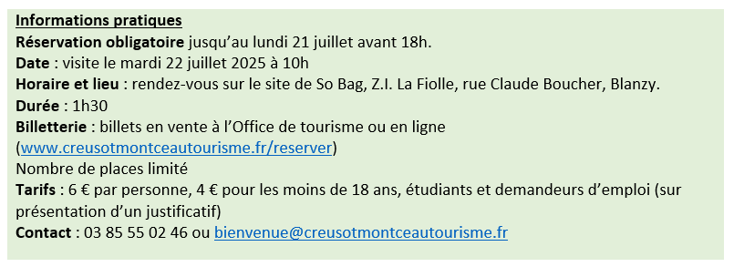 Le prochain rendez-vous aura lieu le mardi 22 juillet à 10h à l’entreprise So Bag, à Blanzy.