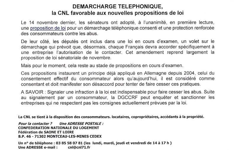La CNL 71 (confédération nationale du logement) est favorable aux nouvelles propositions de Loi sur le démarchage téléphonique et donc une protection renforcée des consommateurs contre les abus. Lire le communiqué ci-dessous : .