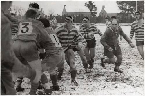 Michel Rozier, au centre, casqué, contre Tarare en 1959-1960 (photo collection M. Rozier).