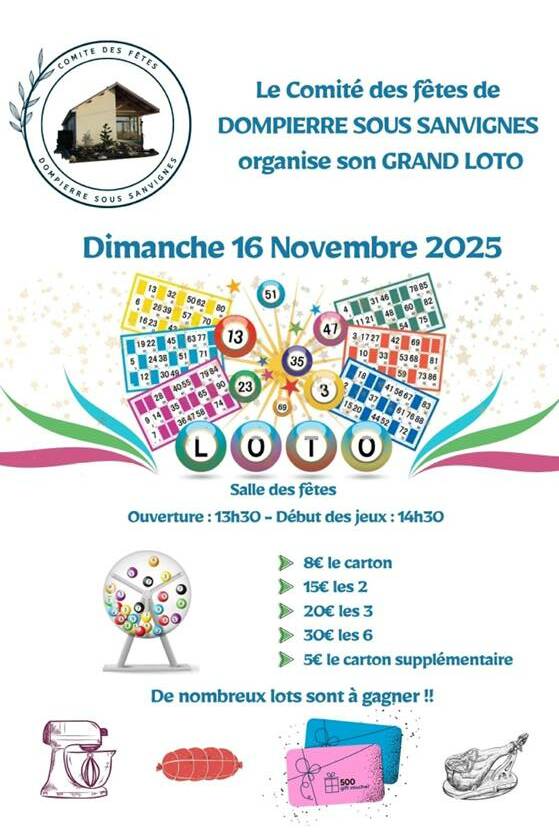 Un loto reste un loto mais, un grand loto, c’est un loto qui est encore mieux qu’un loto. C’est ce que vous propose le comité des fêtes de Dompierre-sous-Sanvignes, dimanche 16 novembre 2025 à la salle des fêtes.