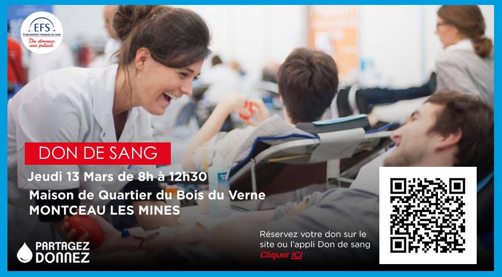 La collecte de sang du mois de mars 2025 aura lieu le jeudi 13 de 8 h à 12 h 30 à la Maison de Quartier du Bois du Verne à Montceau-les-Mines. (voir ci-dessous).
